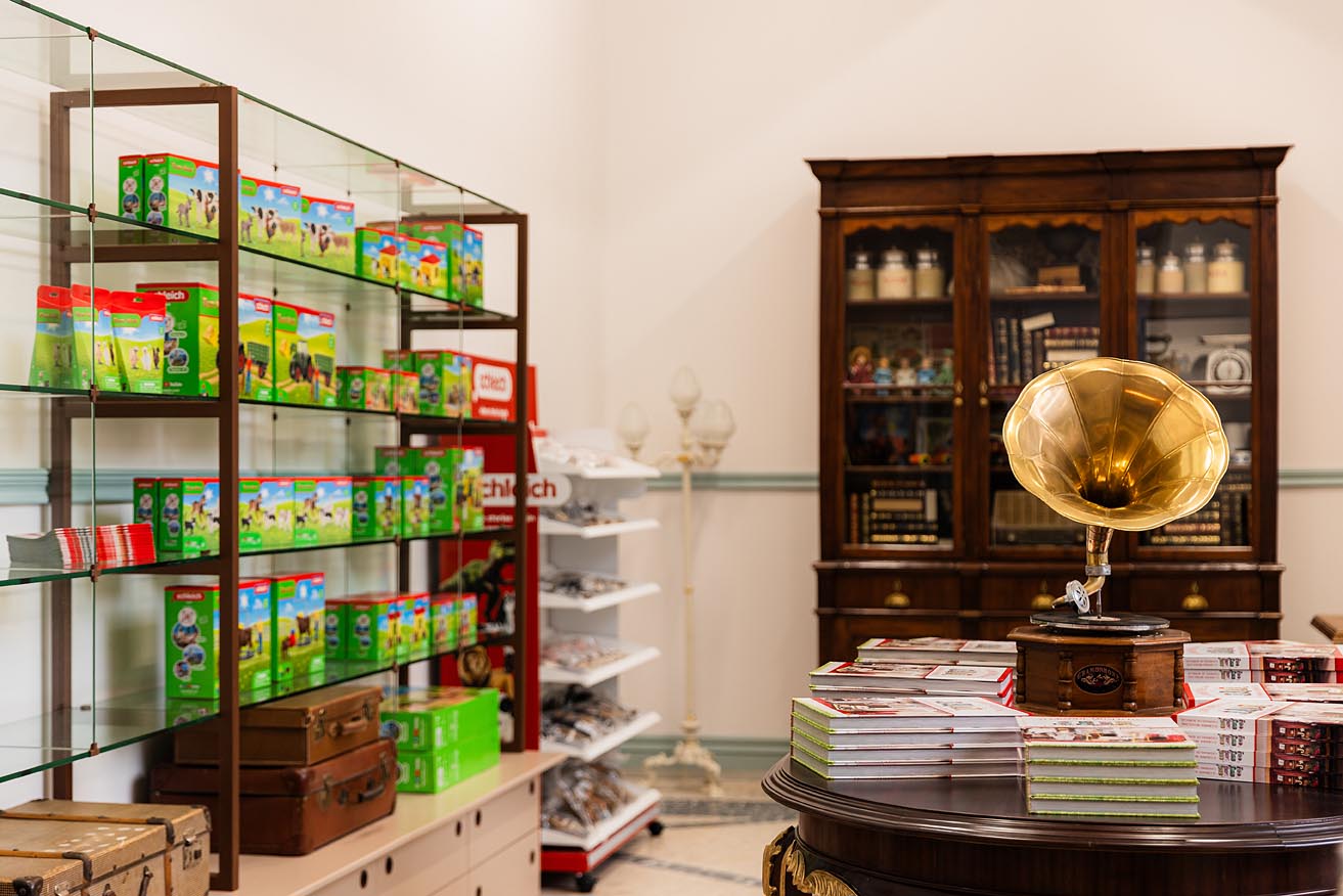 Tendo o museu, um compromisso com o ambiente, na nossa loja podem adquirir os brinquedos da conceituada marca alemã Schleich, estes animais fazem as maravilhas das crianças desde a década de 50 e estão aqui fortemente representadas na nossa exposição, pois apesar de antigas continuarem a ter uma cotação comercial no mercado dos colecionadores, o que lhes confere maior valor patrimonial bem como longevidade. Esta marca tão conhecida produz atualmente bonecos de elevada qualidade e utiliza tintas à base de água, muito amigas do nosso planeta.